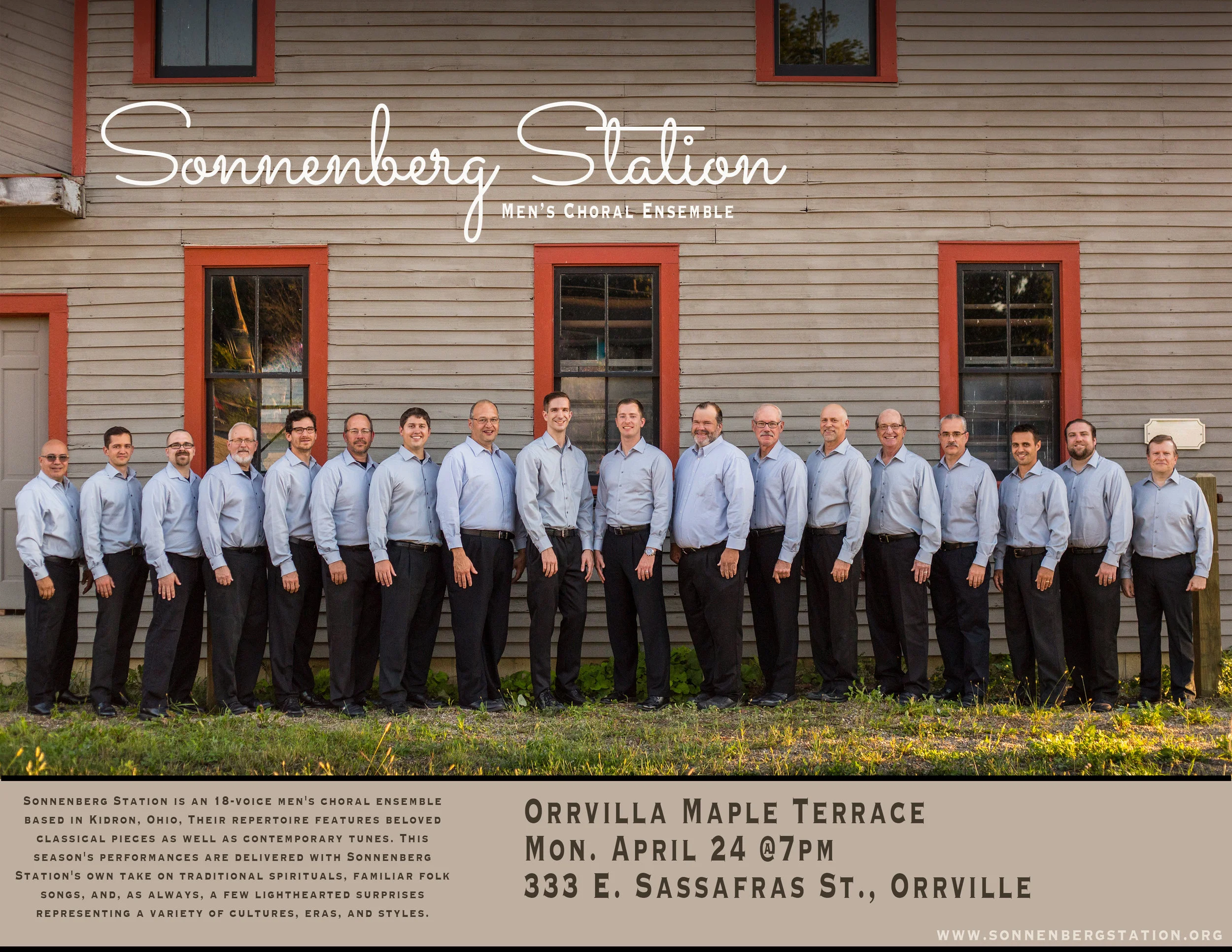Sonnenberg Station is an 18-voice men's choral ensemble based in Kidron, Ohio. Now in its 10th year, the group has performed in more than 50 different venues to appreciative audiences throughout Ohio. Each season offers diverse selections from contemporary to classical, hallowed to lighthearted, including arrangements by the group's director, Tim Shue.